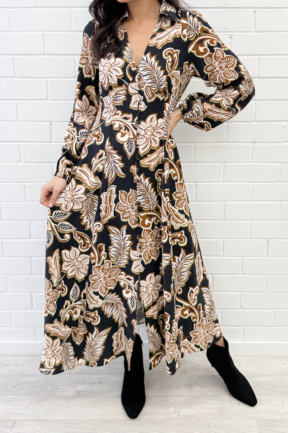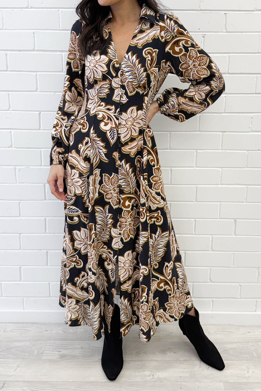 This dress falls beautifully with a flattering shape that’s both elegant and easy to wear. The V-neck with a collar and functional buttons add timeless detail, while elastic cuffs provide a comfortable, polished finish. Fully lined for ease and comfort, it sits at a great length for versatile styling.